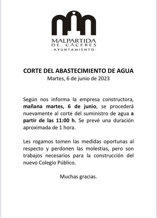 Según nos informa la empresa constructora, mañana martes, 6 de junio, se procederá nuevamente al corte del suministro de agua a partir de las 11:00h. Se prevé una duración aproximada de 1 hora.