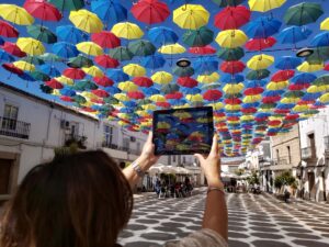 Entre mayo y septiembre la Plaza Mayor se cubre con 1.200 paraguas de colores, convirtiéndose en un atractivo que protagoniza el período estival en Malpartida.